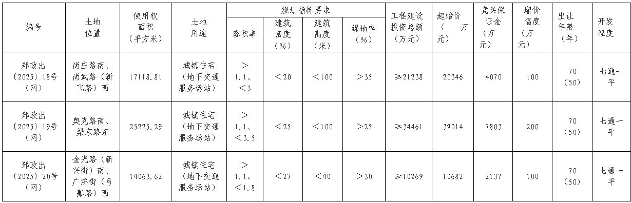 郑政出〔2025〕20号(网)地块位于金光路(新兴街)南、广济街(弓寨路)西,使用权面积14063.62平方米,起始价10682万元。该地块要求容积率介于1.1~1.8,建筑高度不超过40米。