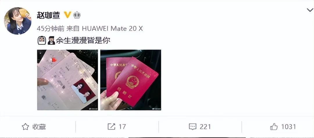 她还在其他平台也发布了结婚领证的消息,晒出多张夫妻甜蜜合照写道:“无论是顺境或者逆境、富俗或者贫穷、健康或者疾病、快乐或者忧愁,我都永远爱着您、珍惜您,对您忠实,直到永永远远。”